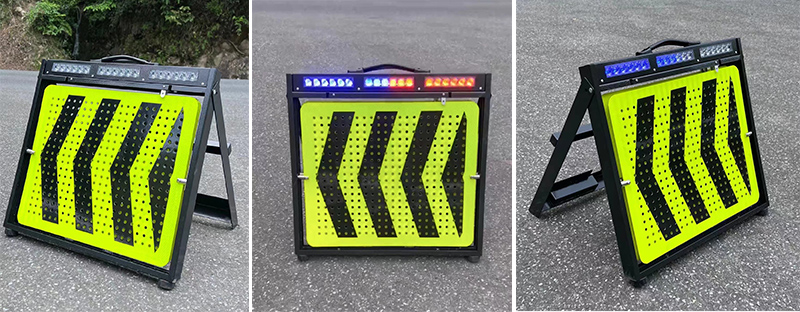 發(fā)光警戒牌主要用于路面臨時管理,在道路交通執(zhí)法及事故現(xiàn)場應(yīng)急使用,作為預(yù)警標(biāo)志置于道路側(cè)方,提前警示車輛減速,緩慢通過事故現(xiàn)場或停車。警戒牌上顯示高亮度反光字符及警示符號,行車狀態(tài)中可視距離可達(dá)300米以上,也適合氣象不佳及夜晚使用。配套的高亮度紅藍(lán)爆閃警示燈,夜間預(yù)警效果更明顯。兩款導(dǎo)向牌為單獨(dú)個體,可自由翻轉(zhuǎn)、快捷拆卸,導(dǎo)向牌內(nèi)容組合多樣化,可滿足不同預(yù)警需求。具備獨(dú)特設(shè)計(jì),使用時可快速展開與收納,收納后可輕松放入汽車后備箱。