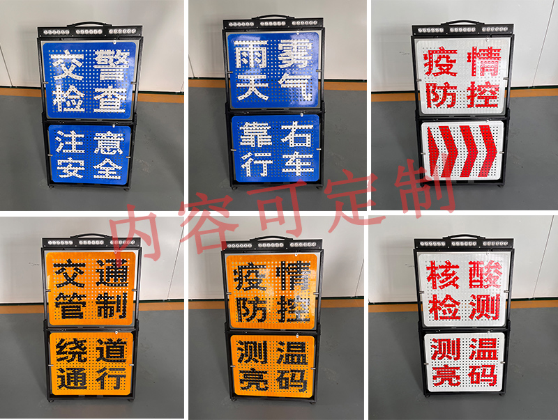 兩塊(四面)反光警示牌內(nèi)容可按要求定制:如“交通管制”、“前方事故”、“警察臨檢”、“禁止超車”、“謹(jǐn)慎駕駛”、“靠邊停車”、“依次通過”、“接受檢查”、“ <<<< ”左向、“ >>>> ”右向等