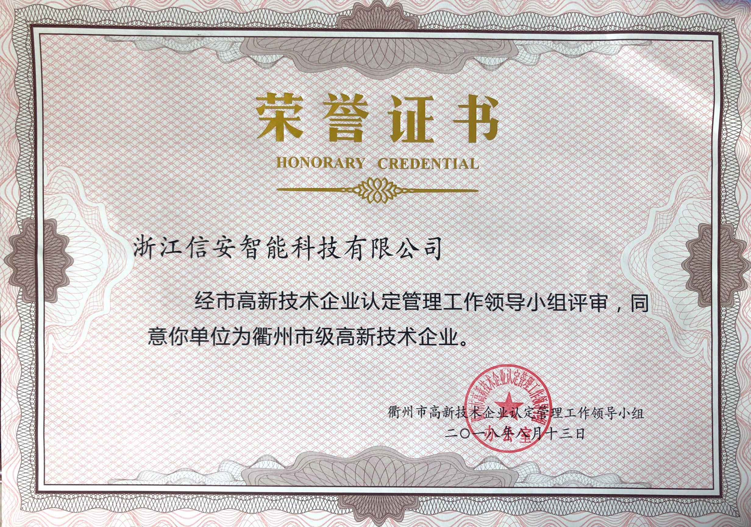 經(jīng)市高新技術(shù)企業(yè)認(rèn)定管理工作領(lǐng)導(dǎo)小組評審,同意浙江信安智能科技有限公司為衢州市級高新技術(shù)企業(yè)。