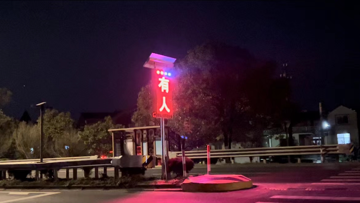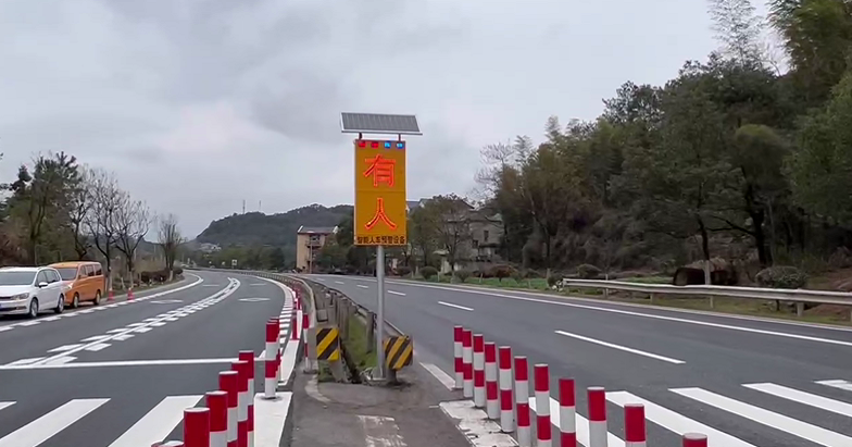 該設(shè)備主要安裝在鄉(xiāng)道與國(guó)道、省道交叉路口事故易發(fā)路段。當(dāng)設(shè)備上兩側(cè)的雷達(dá)探測(cè)感應(yīng)到行人或電動(dòng)車將要穿行交叉路口時(shí),自動(dòng)觸發(fā)“有人”閃爍,提醒雙向汽車駕駛員前方路口行人穿行,注意安全減速慢行,可有效減少交通事故的發(fā)生。