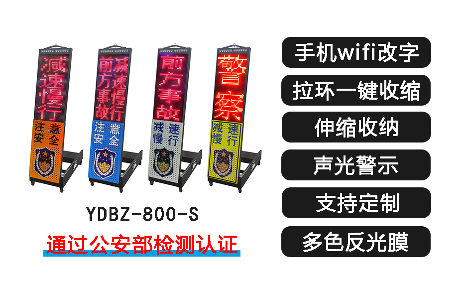 伸縮臨檢警示屏,是一種具有警示燈、LED顯示屏、警示牌、警報(bào)、語音播放于一體的安全警示防護(hù)設(shè)備。警報(bào)和文字信息提示可同步進(jìn)行,可視距離遠(yuǎn),警示效果好。有效起到實(shí)時(shí)路況信息提示、預(yù)警等功能,同時(shí)提高路面行駛車輛的安全駕駛。主要用于警察臨檢,事故及施工現(xiàn)場的警示。底部裝有滑輪,方便移動(dòng)、攜帶。